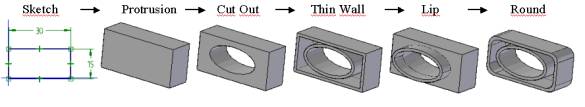 Part’i kasutatakse individuaalsete 3D mudelite konstrueerimiseks. Detaili elemendid sisaldavad eendeid (protrusion), väljalõikeid (cut-out), pressitud (extruded), pööratud (revolved), venitatud (swept), avasid (hole), ribisid (rib), õhukeseseinalisi tahke (thin-wall), faase (chamfer) jne (vt Joonis 3). Samuti saab konstrueerida ristkülikukujulisi ja ümaraid mudeleid ja peegelduskoopiaid.