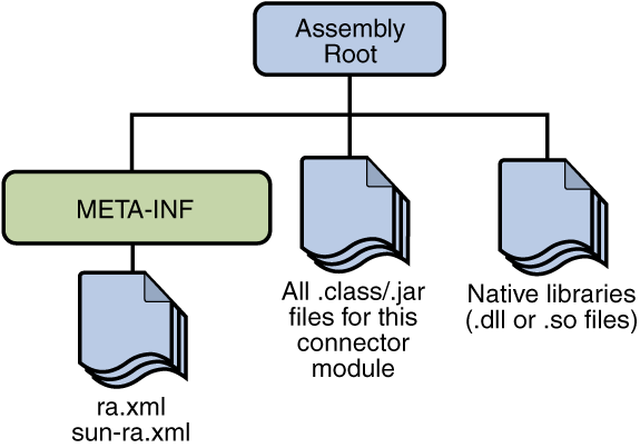 Stored in a Resource Adapter Archive (RAR) file, a resource adapter can be deployed on any Java EE server, much like the EAR file of a Java EE application. An RAR file may be contained in an EAR file, or it may exist as a separate file. See Figure 36-2 for the structure of a resource adapter module.