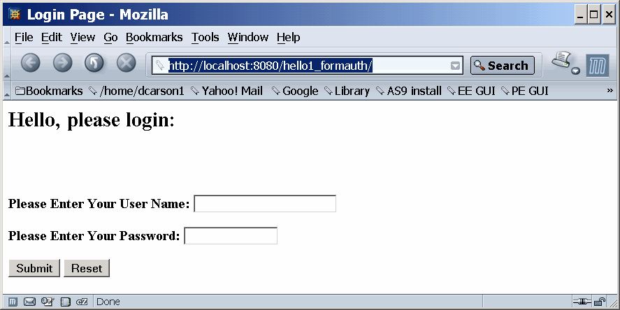 <INSTALL>/javaeetutorial5/examples/web/hello1_formauth/web/logon.jsp. An example of the running login form page is shown later in Figure 30-6. Here is the code for this page:<html> <head> <title>Login Page</title> </head> <h2>Hello, please login:</h2> <br><br><form action="j_security_check" method=post><p><strong>Please Enter Your User Name: </strong><input type="text" name="j_username" size="25"><p><p><strong>Please Enter Your Password: </strong><input type="password" size="15" name="j_password"><p><p> <input type="submit" value="Submit"> <input type="reset" value="Reset"> </form> </html>The login error page is displayed if the user enters a user name and password combination that is not authorized to access the protected URI. For this example, the login error page can be found at
