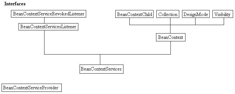 java.beans.beancontext, take a minute to look over the following hierarchy diagram. You will notice that the majority of the package is defined as interfaces, which allow for multiple inheritance.Inheritance Diagram of the BeanContext API